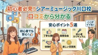鶴見エリアで音楽教室を探していて、「シアーミュージック鶴見校」が気になっているものの、実際の評判や自分に合う教室なのかわからず、一歩踏み出せずにいませんか?音楽教室選びで後悔しないためには、料金やアクセスといった表面的な情報だけでなく、レッ...