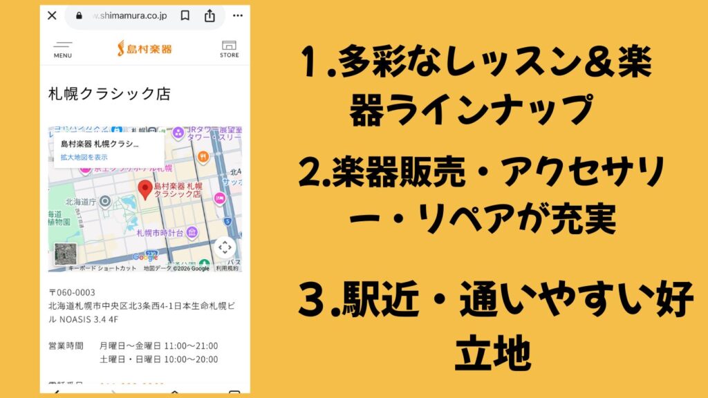| 島村楽器札幌クラシック店 | 子ども〜大人 | 個人/グループ | ◎ 初心者〜経験者対応 | 楽器販売と連携・発表会あり・幅広いジャンル | 商業施設内・駅近で通いやすい |