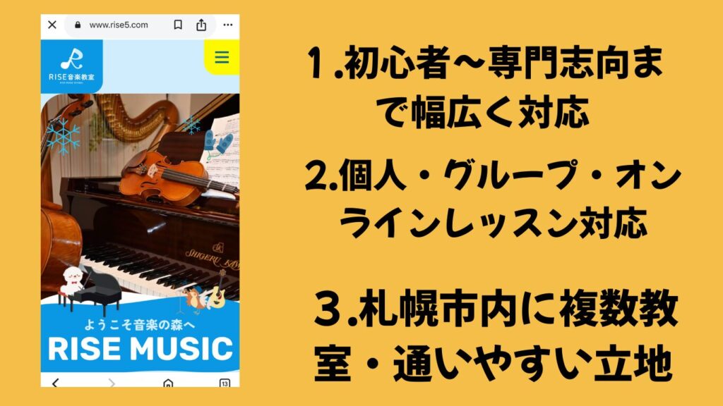 | ライズ音楽教室 | 子ども〜大人 | 個人/オンライン可 | ◎ 初心者OK | 幅広いジャンル・オンライン受講可・柔軟な受講スタイル | 札幌市内複数拠点で通いやすい |