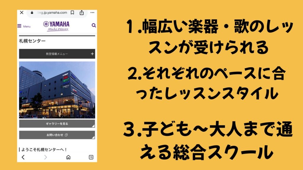| ヤマハミュージック札幌センター | 幼児〜大人 | 個人/グループ | ◎ 初心者OK | 独自カリキュラム・リトミックから大人向けまで対応 | 札幌駅近・アクセス便利 |