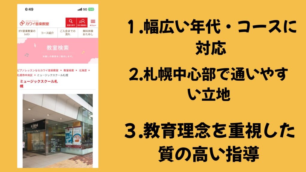 | カワイ音楽教室ミュージックスクール札幌 | 幼児〜大人 | 個人 | ◎ 初心者OK | リトミックや表現力重視・質の高い講師陣 | 札幌中心部・駅近で通いやすい |