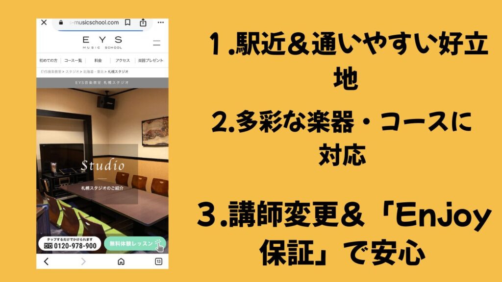 | EYS音楽教室札幌スタジオ | 子ども〜大人 | マンツーマン | ◎ 初心者OK | 講師変更可・Enjoy保証あり・多彩なジャンル対応 | 札幌駅近・アクセス便利 |
