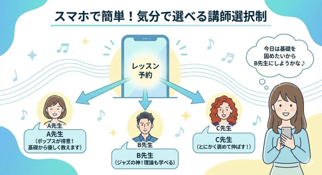 これこそが、シアーミュージック最大の強みです。多くの音楽教室では一度担当講師が決まると変更しづらいものですが、シアーミュージックではWebの予約システムを使って、レッスンごとに講師を自由に指名・変更できます。